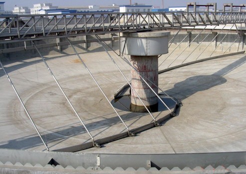 原水從池底經(jīng)中心支墩上部流出,并經(jīng)導(dǎo)流筒配水后,呈輻射流向池子周邊集水槽出水,隨著輻向流速的降低,原水中的懸浮物被分離而沉降于池底。旋轉(zhuǎn)桁架以中心支承為圓心,端部走輪在驅(qū)動(dòng)裝置的作用下,沿池周軌道回轉(zhuǎn)運(yùn)行,帶動(dòng)下部近似對(duì)數(shù)螺旋線(xiàn)運(yùn)行軌跡的刮泥板緩慢轉(zhuǎn)動(dòng),刮集至沉淀池中心集泥槽,依靠水壓或泵排出池外,上部浮渣由刮渣板同步刮至排渣斗排出。